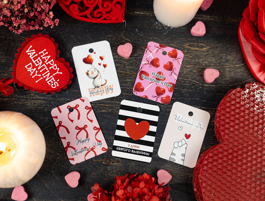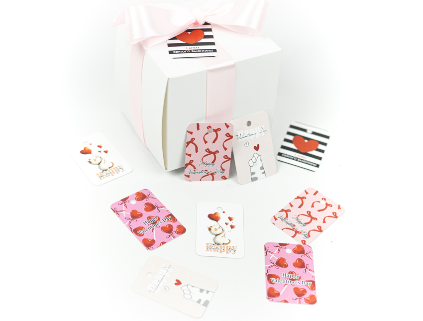 Набор открытки и бирки с праздничной надписью – стильное дополнение для подарков ко Дню влюбленных.