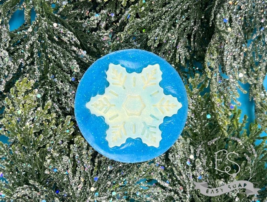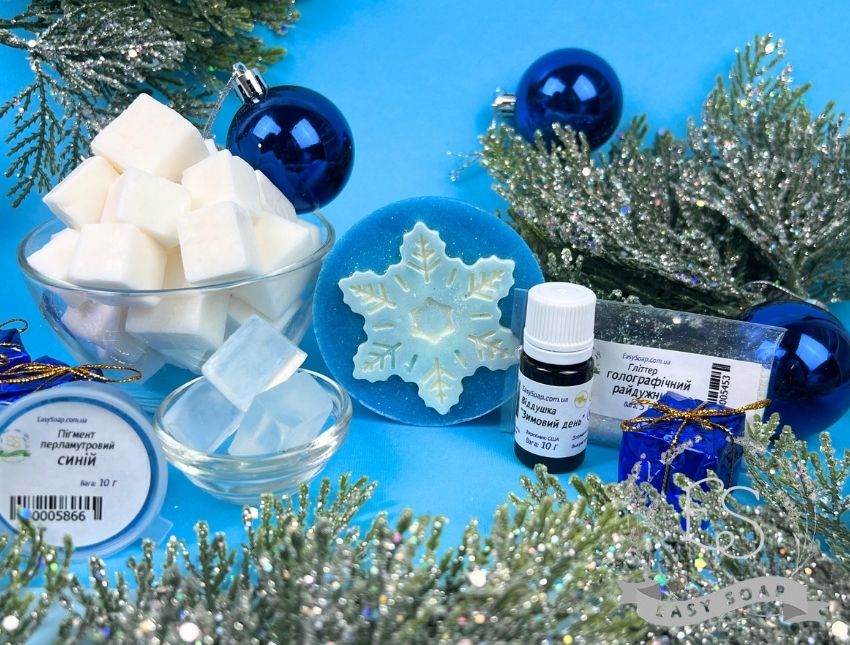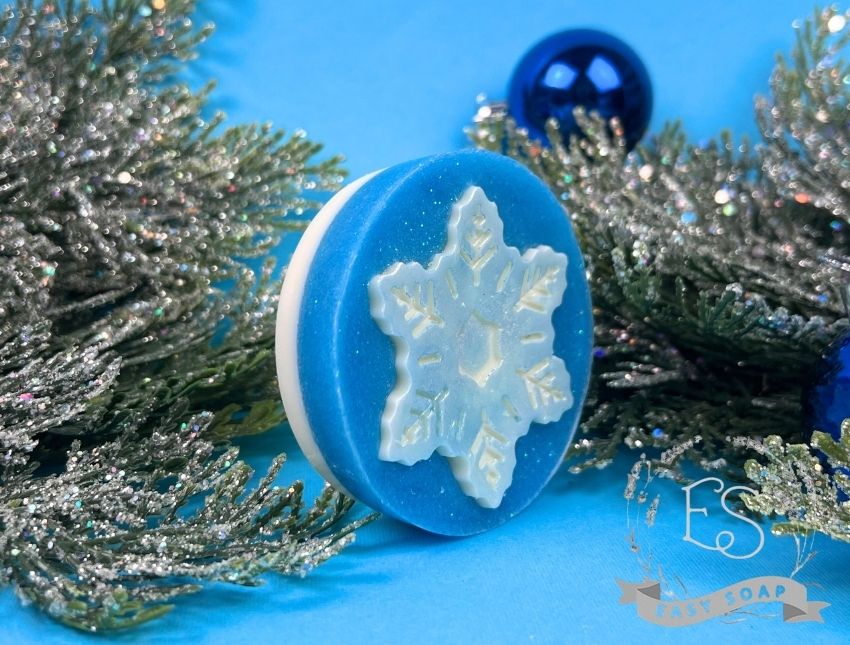 3. Отдельно топим 50 г основы Swirl, добавляем синий перламутровый пигмент, голографический глиттер и еще 2 капли отдушки. Получаем красивую «морозную» массу.