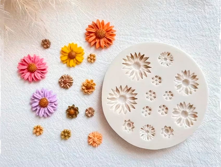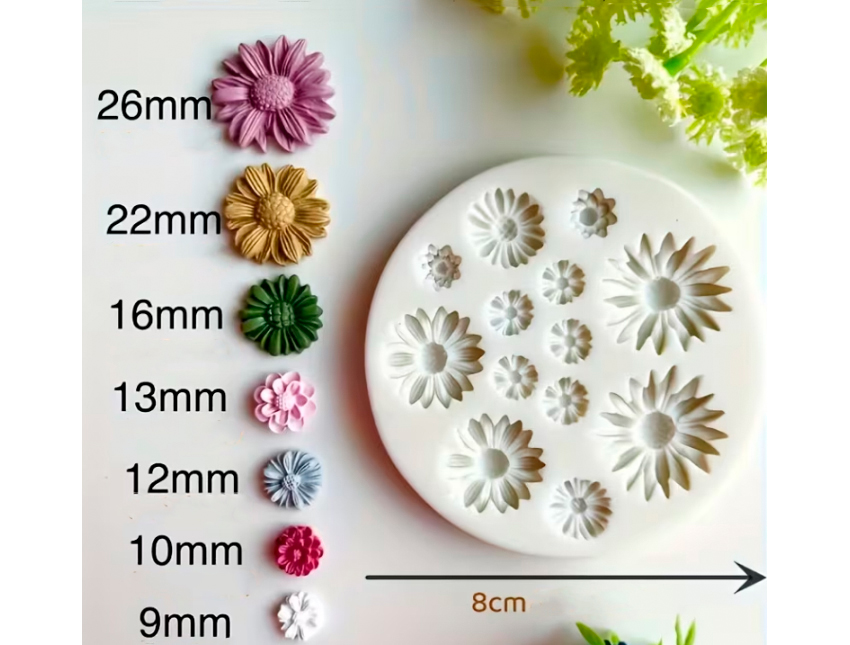 Гибкая и многоразовая форма предназначена для создания декоративных изделий из эпоксидной смолы в виде разных цветов. 13 форм разного вида цветов размером от 0,9 см до 2,6 см