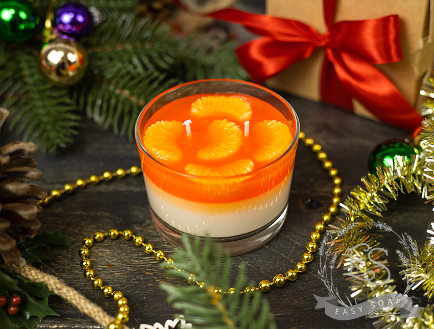 Соевый воск и свечной гель, украшенный дольками мандарина из вОска и имеет настоящий аромат мандарина.