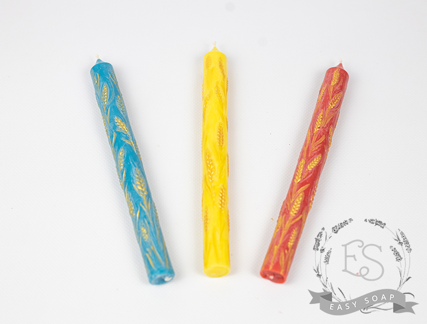 Свічка виконана з оливкового воску, довжина 20 см діаметр 2 см ,вагою 50 грамів, оздоблена колосками.