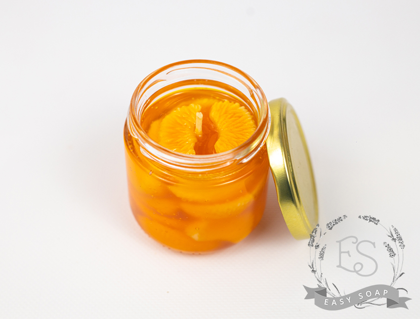 Виготовлена з декоративних соєвих скибочок мандарину та залита свічним гелем.