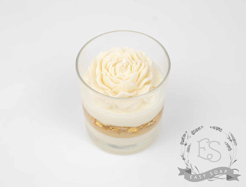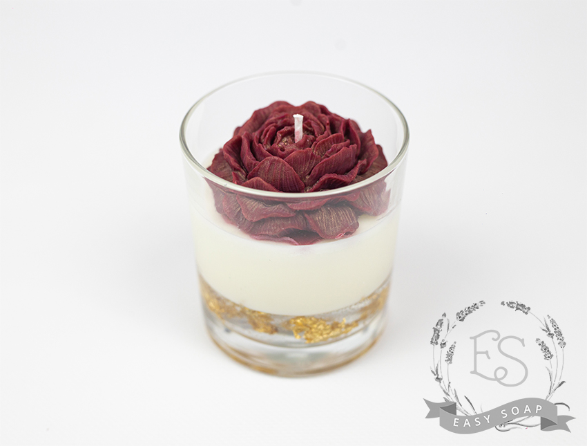 Свічка виготовлена з соєвого віску та гелю для свічок,золота поталь,бововняний гніт,аромат-півонія.