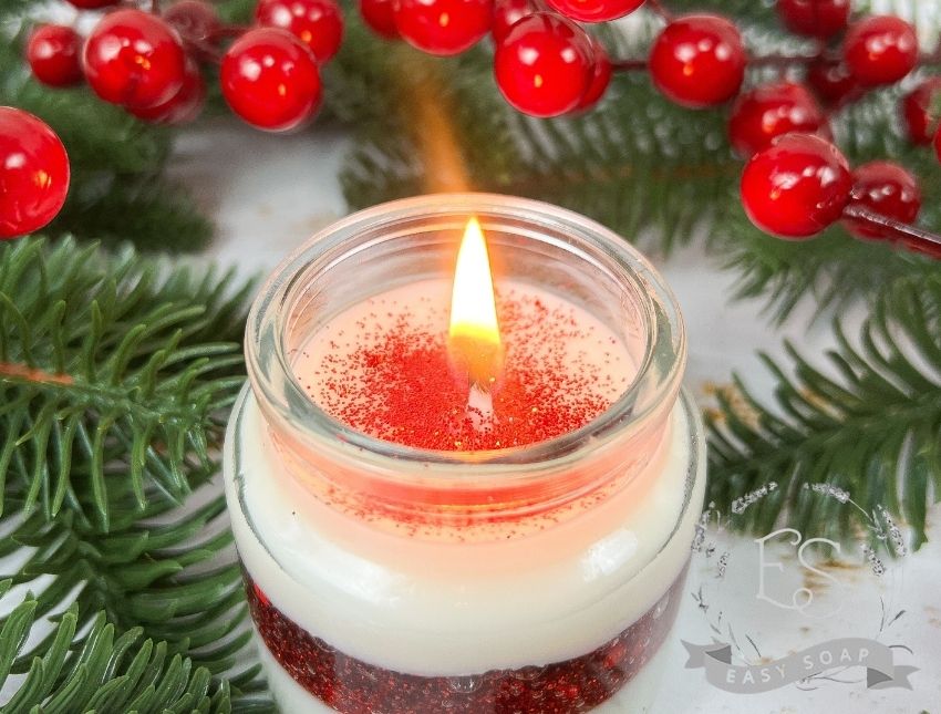 4. Для другого шару змішуємо 40 г свічного гелю з червоним глітером (гексагон) і 2 г тієї ж віддушки. Перемішуємо до рівномірного блиску та заливаємо поверх застиглого шару воску.
