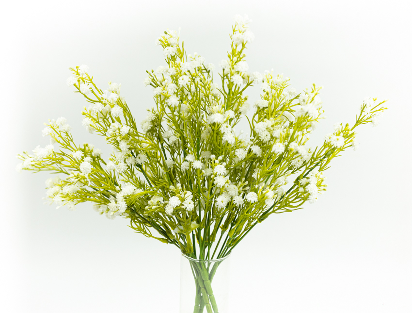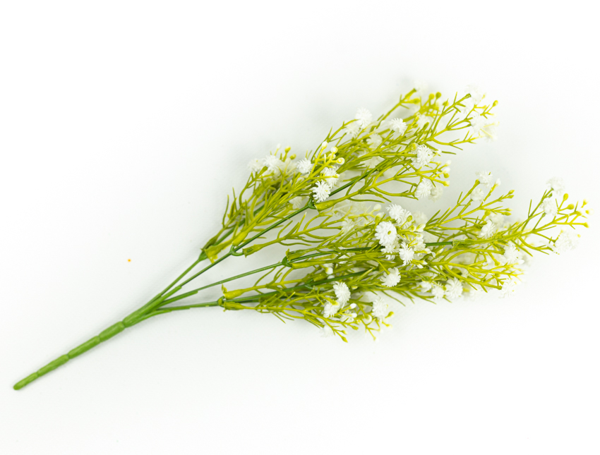 Веточка содержит 5 ответвлений и 5 лиственных веточек с мелкими белыми цветочками.